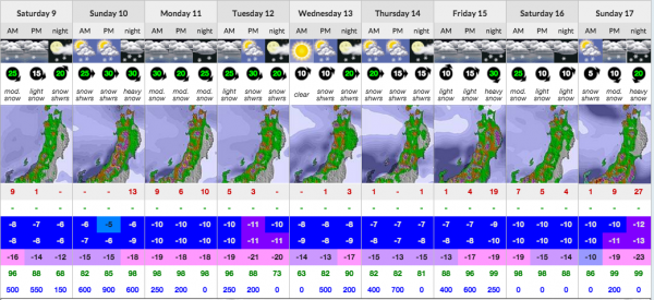Looking ahead into next week, there’s the chance of another big storm set to strike Nozawa Onsen next weekend. We’ll see how this week plays out will keep the updates coming as to what the skies are doing.
