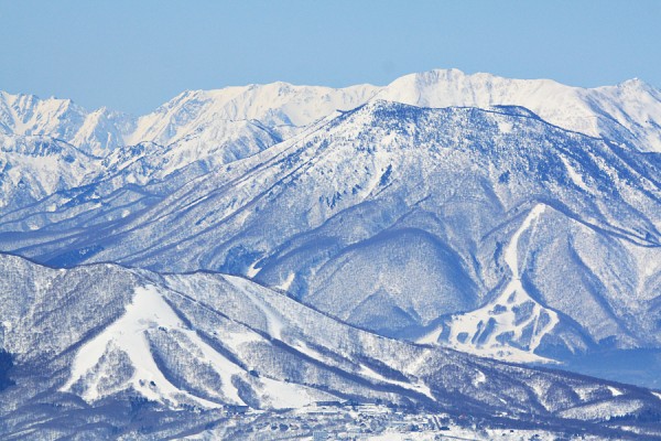 Madarao and unknown resort in the distance we can see the towering Hakuba range over 65km away.
