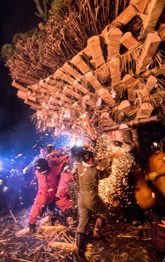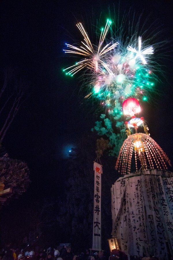 What a great success. The Fire Festival, one of the yearly highlights at Nozawa Onsen took place last night and brought hundreds of locals and foreigners alike. The festivities began a couple of hours after finishing up a beautiful day on the slopes, and continued late into the night. The blue skies turned into a clear and cold night, filled with light and smoke.