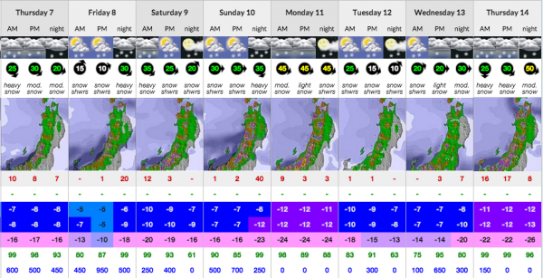 The next few days are looking exciting for us here at Nozawa Onsen. After having a slow start to the season with less snow than we expected, we should be in for a treat over the next few days. Tomorrow should bring us a fair amount of snow right down to the village and it won’t be melting away with temperatures staying below -2 degrees at the base and around -5 up the top.