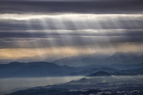 Sunbeams over Nagano and the Japanese Alps. Shot with a mid telephoto from the Skyline double chair.