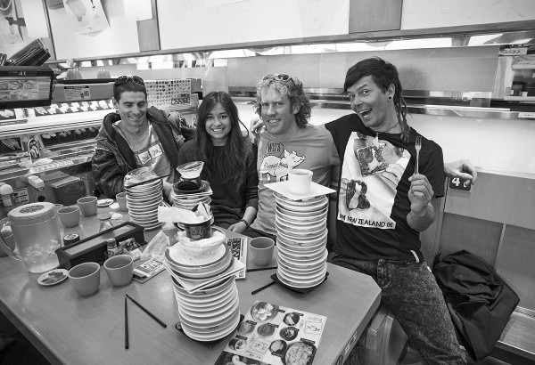 Sushi train locals Lucas, Tia, Jules and Jerry putting on an impressive performance. Jules took the number one spot with 23 plates.